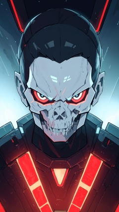 ((((masterpiece)), photographic)), ((cartoon style)), professionally detailed, ultra-high detail, sharp, insanely detailed, masterpiece, Skull facial-like head menacing cyborg in the space station with a mean look, ultra detailed, neon lights reflections, reflection mapping, intricate design and details, dramatic lighting, hyperrealism, photorealistic, cinematic, 8k, dramatic lighting, ultra high resolution, (best left shadow:0.9), RAW