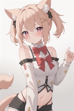 masterpiece,best quality,1girl,upper body,highres,absurdres,lens flare,tail,panties,shorts,detached sleeves,bare shoulders,hair ornament,bowtie,blush,simple background,