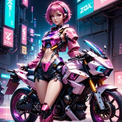 anime artwork of a girl\(cyberpunk, mecha\) with motorcycle\(ZOTAC Futuristic Motorcycle\), full body, Pink parted short hair, pink eyes, imperious, cyberpunk, dramatic, key visual, vibrant, highly detailed, holographic, look back,<lora:EMS-59656-EMS:0.300000>,<lora:EMS-46488-EMS:0.400000>,<lora:EMS-23104-EMS:0.400000>
