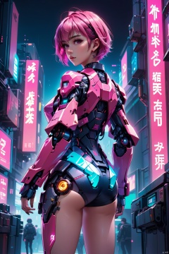 anime artwork of a girl\(cyberpunk,  mecha\),  full body,  Pink parted short hair,  pink eyes,  imperious,  cyberpunk,  dramatic,  key visual,  vibrant,  highly detailed,  holographic, shot from back,<lora:EMS-59656-EMS:0.300000>,<lora:EMS-46488-EMS:0.300000>,<lora:EMS-23104-EMS:0.300000>