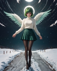 1 girl + looking at the audience + detailed face+short hair,green hair,bangs,feathered wings,shiny_pantyhose,pleated_skirt,turtleneck_sweater,crescent,winter,full body, masterpiece, best quality