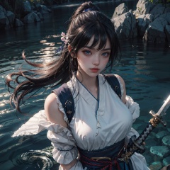 ((detailed light)),cinematic lighting,lens flare,light leaks,sunlight,shine,beautiful detailed glow,best quality,masterpiece,illustration,an extremely delicate and beautiful,extremely detailed,CG,unity,8k wallpaper,Amazing,finely detail,masterpiece,best quality,official art,extremely detailed CG unity 8k wallpaper,beautiful detailed girl,extremely detailed eyes and face,beautiful detailed eyes,absurdres,incredibly absurdres,huge filesize,ultra-detailed,highres,extremely detailed,dynamic angle,floating,frills,painting,depth of field,Depth of field,nature,solo,fashi-girl,1girl,portrait,(upper body),(hanfu),illustration,((glowing sword)),water,sea spray,flame,((holding sword)),fluttered detailed ink splashs,[[colorful5]],((messy hair)),very long hair,((eyes glowing)),, masterpiece, best quality