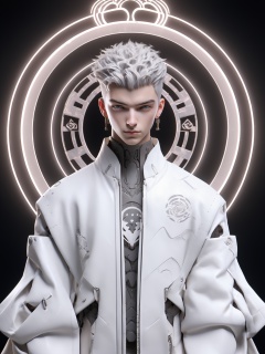 standing,((full body)),((full view)),Golden ratio figure, tall,a young individual with a striking appearance. They have silver-white hair styled in a tousled manner, and their eyes are intense, gazing directly at the viewer. The person is wearing a white, futuristic-looking jacket with intricate patterns and designs,Futuristic Pants,The jacket has a circular emblem on the left side, which appears to be a stylized bird or creature. The background is dark, with a glowing circular design that emits a soft light, creating a contrast with the subject<lora:Suotai-000006:1>