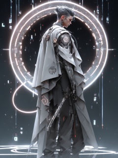 a character, possibly male,standing,full body,full view, with a futuristic or cyberpunk aesthetic. He has a sleek, silver-grey outfit with intricate details, including a chest plate with a circular design and a long, flowing cloak. The character's hair is styled in a bun, and he has a piercing on his left ear. He is holding a long, slender weapon in his right hand, and there are various digital elements, such as floating icons and a glowing circle, in the background<lora:Suotai-000006:1>