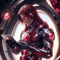 <lora:GemTech-22:0.8>, gemtech , scifi, internal reflections , transparent, inner details , ruby,scholar , scroll, 1boy,long hair, red hair, glowing eyes, smile,shaved beard, ,closed mouth,  holding a tablet