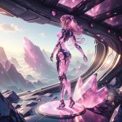 <lora:GemTech-22:0.8>, gemtech , scifi, internal reflections , transparent, inner details ,  rose quartz ,synthetic girl , full body, on a hill,  long hair, epic scenery
