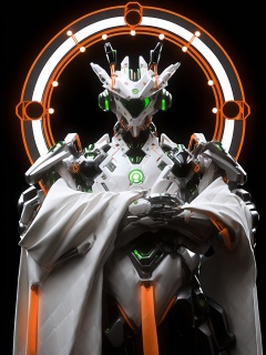 The image showcases a futuristic robotic entity. It has a sleek, white and gray design with intricate details, including green lights and various mechanical components. The robot is adorned with a circular halo-like structure made of neon orange and white lights. The entity's head is particularly distinct, featuring multiple protruding elements and a central green light. The robot's arms are crossed, and it drapes a white cloth over one of its arms. The overall ambiance of the image is dark, emphasizing the robot's illuminated features.<lora:Suotai-000006:1>