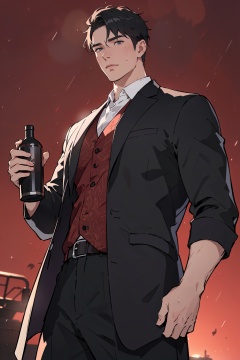 1boy,red background,absurdres,masterpiece,highres,intricately detailed,strutting outdoors,gorgeous eyes,detailed face,pouring rain,outdoors,global illumination,subsurface scattering,cowboy_shot,