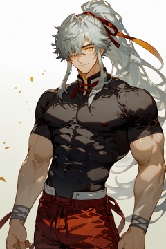 <lora:景元V1:1>,<lora:效果提升写实感与饱和度AQLORA:1>,<lora:修手neg4all_bdsqlsz_V3.5:0.8>,jinyuan,hair ribbon,(yellow eyes:1.5),ribbon,red ribbon,cowboy shot,solo,smile,shirt,muscular,hair ribbon,pectorals,looking at viewer,ribbon,muscular male,pants,black shirt,covered abs,gradient background,gradient,tight,red ribbon,red shorts,tight shirt,skin tight,cowboy shot,<lora:效果肌肉滑块muscle_slider_v1:1>,long hair,ponytail,, masterpiece,best quality,masculine appeal,handsome face,finely detailed eyes and face,youthful face,detailed eyes,Perfect features,narrow_waist,male focus,1boy,