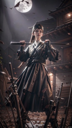 1 Girl, Long Hair, Gauze Cap, Holding Tai Dao, Waist Sheath, Sports Pose, Night, Outdoors, Street, Bright Full Moon, White Petals, Falling, Mirrored Floor, Splash, Rain.