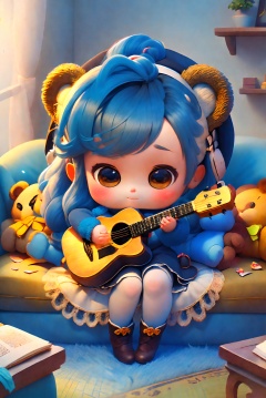 chibi, fullbody, 1girl,blue long hair, bear ears, black dress, long brown boots, holding guitar, sitting on the blue sofa, with a teddy bear doll, masterpiece, best quality, highres, delicate details,.