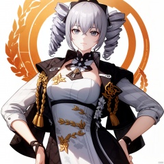 (masterpiece:1.3),(the best quality:1.2),(super fine illustrations:1.2),(Masterpiece),high quality,high detail,(full body:1.2),(((white background:1.2))),looking at viewer,(SOLO:1.4),outline,((simplebackground)),, ahoge,hair between eyes,bangs,twin drills,grey eyes,grey hair,mecha,long hair,drill hair,bronya zaychik,1girl,solo,crossed bangs,silver hair,