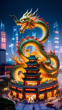 (Fantasy Microcosm) In the center of the city stands a massive Chinese dragon culinary sculpture, creating a majestic sight of the city of gluttony in the year of the dragon. The entire sculpture consists of a variety of culinary delights, with sparkling light flowing from every part of the dragon's body, as if the entire city is wafting with the aroma of cooking, creating a delicious and stately spectacle along with the other buildings, streets, and alleys of the city. The surroundings of the Dragon City add to the mysterious and solemn atmosphere of the dragon design.