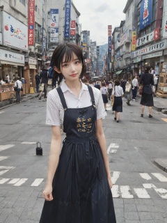 1girl, solo, shirt, black hair, dress,smile,school uniform, white shirt, short sleeves, outdoors, solo focus, day, blurry, arm up, blurry background, looking up, realistic, pinafore dress, building, scenery, city, sign, cityscape, street, crowd, shop, real world location, storefront.