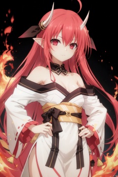 solo,1girl,red hair,long hair,red eyes,white background,bare shoulders,horns,ahoge,fire,hand on hip,simple background,looking at viewer,very long hair,japanese clothes,small breasts,ribbon,