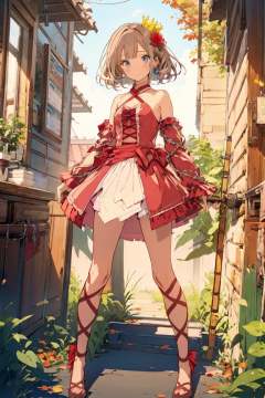 1girl,solo,chain,bow tie,crown,flower,detached sleeves,red dress,puttee,dance shoes,<lora:RomeoAndCinderella:0.8>,RAC,cowboy_shot,smile,(autumn maple forest:1.3),(very few fallen leaves),(path),grove,maple leaf,, masterpiece,best quality,highres,ultra high res,(abstract art:1.2),2d,(highlydetailed),(colorful),(intenseexpression),(fashionable),