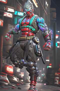 1boy,male focus,<lora:CyberGenji:1>,cybergenji,<lora:Cyberworld_20230622141420-000018>,Cyberworld,solo,cyborg,sandals,fangs,ninjamecha,mechanical arms,2d,street,neon lights,night,