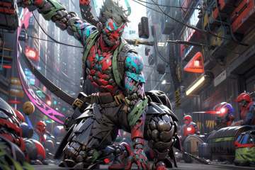 1boy,male focus,<lora:CyberGenji:1>,cybergenji,<lora:Cyberworld_20230622141420-000018>,Cyberworld,solo,cyborg,sandals,fangs,ninjamecha,mechanical arms,2d,street,neon lights,(night:1.5),glowing,glowing eyes,no human being,(thick limbs:1.3),mask,muscular,weapon on back,, masterpiece,best quality,highres,ultra high res,(abstract art:1.2),2d,(highlydetailed),(colorful),(intenseexpression),(fashionable),