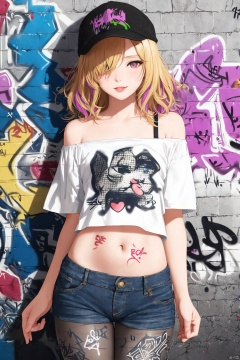 (very shot) cutoff jeans, (black pantyhose:1.2), bare legs, (wide strap), flat cap, (graffiti pattern off-shoulder white T-shirt:1.3),