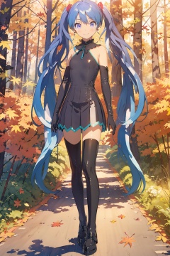 1girl,solo,full body,looking at viewer,long hair,hatsune miku,twintails,very long hair,(black dress:1.1),<lora:test1:0.8>,neck ribbon,elbow gloves,black black gloves,black thighhighs,blue hair,purple hair,purple eyes,(autumn maple forest:1.3),(very few fallen leaves),(path),wheat field,field,(smile:1.2),panorama,full_shot,walking,, masterpiece,best quality,highres,ultra high res,(abstract art:1.2),2d,(highlydetailed),(colorful),(intenseexpression),(fashionable),