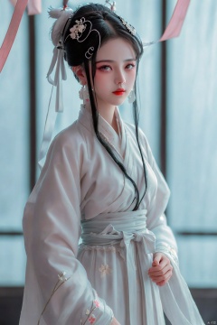 Realistic: 1.3, Masterpiece, Highest Quality, High Resolution, Details: 1.2, 1 Girl, Bun, Hairpin, Beautiful Face, Delicate Eyes, Tassel Earrings, Necklaces, Bracelets, Hanfu, Su Embroidered Hanfu, Streamers, Ribbons, Elegant Stand Posture, Aesthetics, Movie Lighting, Ray Tracing, Depth of Field, Layering,Fluttering, Hanfu, qingsha