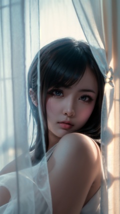 (((masterpiece))),(best quality),((ultra-detailed)),(intricate details),high-resolution image,Asian ethnicity,young woman,((peeking from behind curtains)),beautiful eyes,macro shot,colorful details,natural lighting,analog film,detailed skin,amazing composition,subsurface scattering,velus hairs,amazing textures,filmic,chiaroscuro,soft light,