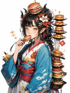HEZI, burger, food, 1girl, japanese clothes, kimono, black hair, braid, long hair, holding, solo, upper body, hair ornament, holding food, looking at viewer, bangs, long sleeves, blush, horns, sash, eating, flower, wide sleeves, blue kimono, obi, french fries, fang, drinking straw, pointy ears, object on head, food on head, white kimono, single braid, animal print, chinese zodiac, cup, earrings, jewelry, food in mouth, hair flower, nail polish, mouth hold, sidelocks, brown eyes, orange eyes, egasumi, print kimono, new year, white background, braided ponytail <lora:盒子系列——吃货女孩:0.65>
