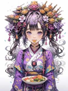 HEZI, 1girl, solo, hair ornament, japanese clothes, bowl, kimono, purple eyes, flower, food, hair flower, looking at viewer, bangs, upper body, chopsticks, hair bun, blush, purple hair, double bun, floral print, jewelry, earrings, smile, nail polish, grey hair, print kimono, noodles, closed mouth, eating, sidelocks, red flower, egasumi, grey background, food-themed hair ornament, :3, blunt bangs, new year, x hair ornament, tassel, black nails, choker, black kimono, pink flower, hairpin, hairclip, headband, portrait <lora:盒子系列——吃货女孩:0.65>