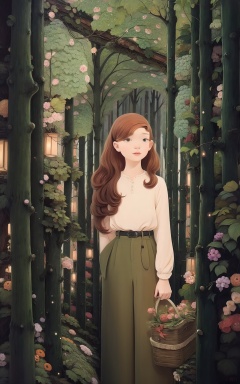 a painting,Balanced body,Long curly auburn updo hairstyle,Misty LilacShirred top and wide-leg trousers,Sweeping vineyard with rows of grapevines,Futuristic dystopian city viewpoint with streets illuminated by phosphorescent lights,Rounded diamond faceHurt facial expression,dynamic attitude,