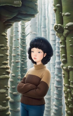 a painting,Tall body,Long dark blue twist-out hairstyle,Frosted Blueberry PieLace-up jeans and chunky knit sweater,Rugged mountain trail with towering pines,Futuristic dystopian city viewpoint showcasing sustainable city planning,Rounded diamond faceFlirty facial expression,dynamic attitude,