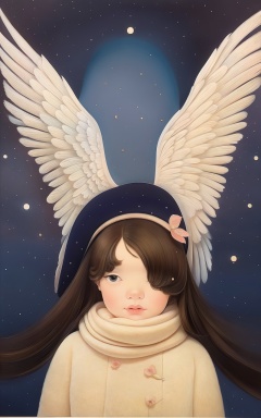 a painting of a woman holding a flower and an angel wings wings are white and blue,and the sky is dark blue,aurora,constellation,earth_\(planet\),galaxy,milky_way,night,night_sky,planet,shooting_star,sky,space,star_\(sky\),starry_sky,starry_sky_print,wings,angel_wings,feathered_wings,white_wings,city_lights,snowing,starry_background,tanabata,star_\(symbol\),mini_wings,astronaut,light_particles,crescent_moon,fireworks,tanzaku,single_wing,scarf,aerial_fireworks,signature,moon,angel,ultimate_madoka,solo,1girl,artist_name,telescope,fireflies,snow,spread_wings,moonlight,twilight,landscape,
