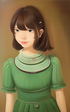 a painting,Wide-hipped body,Mint green choppy layers with bangs hairstyle,Fresh Pear GreenRibbed dress,Rustic pottery studio with clay and tools,Futuristic dystopian city viewpoint with nanoengineered weather control,Rectangle facePleased facial expression,dynamic attitude,
