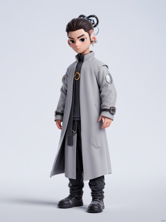 a character, possibly male,standing,full body,full view, with a futuristic or cyberpunk aesthetic. He has a sleek, silver-grey outfit with intricate details, including a chest plate with a circular design and a long, flowing cloak. The character's hair is styled in a bun, and he has a piercing on his left ear. He is holding a long, slender weapon in his right hand, and there are various digital elements, such as floating icons and a glowing circle, in the background