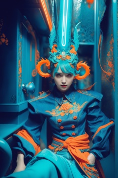 (masterpiece, top quality, best quality, official art, beautiful and aesthetic:1.2) ,cover art, intricate details, Denim Blue and Tangerine, Noxious Geeky "The happy ********-wizards of Insanity", pretty and appealing, Turquoise neon hue