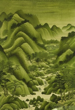 Yshanshui, no humans, scenery, tree, green theme, nature, forest, monochrome, plant, traditional media, outdoors, landscape a painting of a mountain landscape with a river running through it and a man standing on a hill looking at the water, <lora:XL_YSshanshuiV10:0.9>