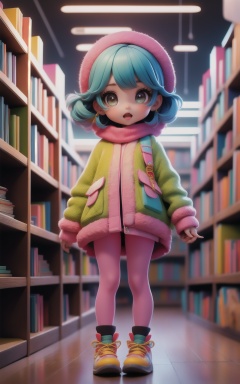 1girl,Short curtain bangs hairstyle,A vibrant, contemporary bookstore, filled with a variety of modern books and a bright, cozy design,Knitted poncho and leggings,Worried facial expression,dynamic attitude,