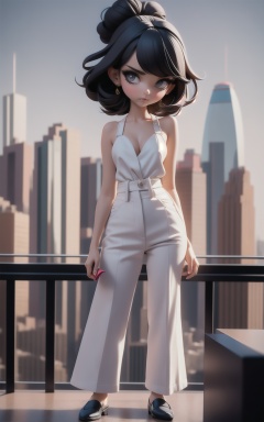 1girl,Short messy hairstyle,A sleek, contemporary penthouse suite, boasting panoramic views of the city skyline,Camisole and wide-leg trousers,Frowning facial expression,dynamic attitude,