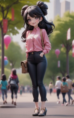 1girl,Medium Length Swoop Bangs Hairstyle,A bustling, modern city park during a vibrant, lively kite festival,Keyhole blouse and slim-fit trousers,Grateful facial expression,dynamic attitude,
