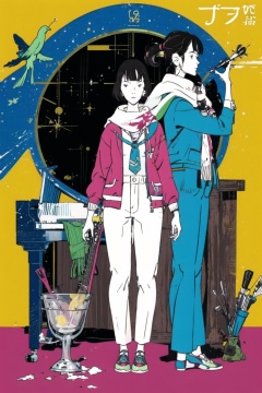pants,shoes,multiple girls,jacket,white ascot,ascot,shirt,necktie,multiple boys,bangs,fruit,magatama,jewelry,long sleeves,food,brown hair,spiked hair,standing,pointing,apple,closed mouth,sidelocks,formal,suit,open clothes,long hair,earrings,outstretched arm,forehead,whip,book,sun,bug,sparkle,black eyes,open book,green jacket,red jacket,rope,clock,scarf,full body,necklace,gem,smile,arm up,happy,hand up,magatama necklace,open jacket,red background,guitar,piano,mole,butterfly,building,bird,crescent,<lora:NakamuraV2:1>,(simple background:1.2),(looking_at_viewer:1.2),front view,full_shot,<lora:Akashi_TatamiGalaxy-000004:1>,single more under right eye,short black hair,, masterpiece,best quality,highres,ultra high res,(abstract art:1.2),2d,(highlydetailed),(colorful),(intenseexpression),(fashionable),