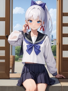 <lora:神里喜茶-000011:1:lbw=role>,kamisato ayaka \(heytea\),kamisato ayaka,school uniform,long hair,ponytail,bangs,serafuku,blue eyes,sailor collar,ribbon,shirt,white shirt,hair ribbon,skirt,long sleeves,blunt bangs,pleated skirt,blue skirt,bow,hair bow,mole,white hair,, 1girl,, (masterpiece,best quality:1.2),absurdres