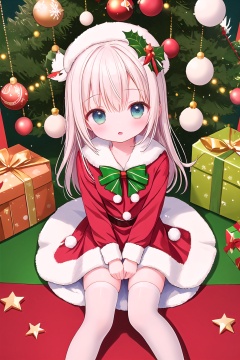 ((Birds view.)) 21yo girl, solo, looking at viewer, Wange_Hu_Christmas_dress, Christmas_dress,Christmas, Christmas tree, Christmas ornaments, , , 1girl, white thighhighs, black pantyhose,serafuku, loli