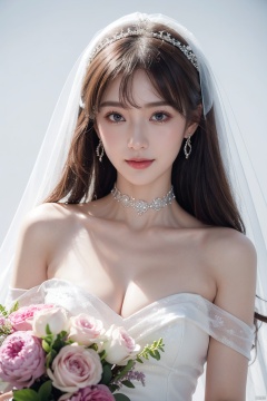 1girl, solo, breasts, looking at viewer, smile, bangs, simple background, hair ornament, dress, holding, cleavage, hair between eyes, bare shoulders, jewelry, closed mouth, purple eyes, collarbone, upper body, pink hair, flower, earrings, choker, white gloves, pink eyes, off shoulder, {white wedding dress}, sparkle, {hair intakes}, white flower, veil, blue flower, bouquet, cropped torso, {{white wedding dress}}, off-shoulder dress, bridal veil, {white choker}, holding bouquet,{upper body},{close-up},Dutch angle,{depth of field},{lensflare},{looking at viewer},{white background}, {{white wedding dress}}, {{white weddingdress}}, {{white weddingdress}}, {{whiteweddingdress}},{{whiteweddingdress}},{{whiteweddingdress}},{{whiteweddingdress}}