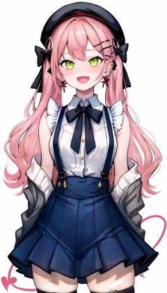 1girl, tokoyami towa, virtual youtuber, solo, long hair, skirt, shirt, green eyes, hair ornament, twintails, tail, horns, purple hair, demon tail, jirai kei, black headwear, hat, looking at viewer, fake horns, pleated skirt, piercing, black skirt, horned headwear, white shirt, bangs, ear piercing, pink hair, tail ornament, hairclip, open cardigan, cardigan, sleeveless, blush, sleeveless shirt, open mouth, tail piercing, grey cardigan, smile, fang, x hair ornament, open clothes, suspenders, suspender skirt, bow, multicolored hair, off shoulder, collared shirt, ribbon, pom pom \(clothes\), high-waist skirt, black ribbon, cowboy shot, beret, hair ribbon, :d, braid, blurry, black bow, breasts, jewelry, long sleeves, earrings, bowtie