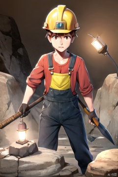 1boy,animation,miner,Hawk billed hoe,young miner,20 years old,wearing a hard hat,miner’s helmet,overalls,holding a pickaxe,digging in a mine,rocks,miner’s hat with a flashlight,