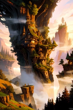 valley, fairytale treehouse village covered, , matte painting, highly detailed, dynamic lighting, cinematic, realism, realistic, photo real, sunset, detailed, high contrast, denoised, centered, michael whelan