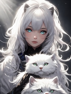 photorealistic of cute girl with white persian cat, Lolita, mane, multicolored hairlighting, glowing crystals, hyper detailed, detailed glow, ambient occlusion, ambient light,Beautiful dynamic dramatic dark moody lighting, volumetric, shadows, BREAK, 35mm photograph, grainy, professional, 8k, highly detailed, Hasselbald 50mm lens f/1.9, [by ethan for CGArt Mayfly model]