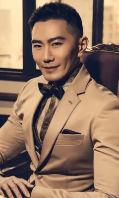 1man,Asian,male focus,Mature,(masterpiece, Realism, best quality, highly detailed,profession),exquisite facial features,handsome,smile,muscular,formal wear,Upper part of the body,soft lighting,blurry,in office