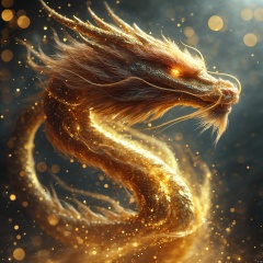 particles,dragon,no humans, simple background, solo, animal, from side, shining eyes,flying,eastern_dragon, particles,golden theme