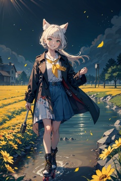 Flowers meadow, (((storm)), fox ears, grin, blunt bangs, neckerchief, trench coat, roller skates, dragons in background, stream, rim light, There are many scattered luminous petals,Hidden in the light yellow flowers,Depth of field,Many scattered leaves,branch ,solo,solo,solo,look at the viewer,(robot)