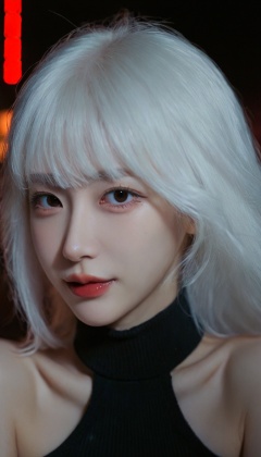 white hair,cityscape,cute 1girl,lip biting,seductive leaning forward,detailed face,realistic,photorealistic,(studio light:1.2),evil smile,choker,Deep photo,depth of field,shadows,messy hair,seductive silhouette play,dark,nighttime,dark photo,grainy,dimly lit,shot on RED camera,harsh camera flash ((eyes closed)),bangs,hime cut,fashion model,upper body,